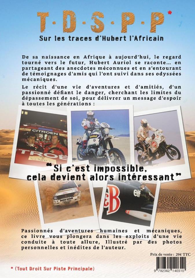 L’ancien vainqueur moto et auto du Paris Dakar viendra notamment dédicacer son livre TDSPP tout droit sur piste principale, publié en janvier dernier. De sa naissance en Afrique en 1952 à aujourd’hui, le regard tourné vers le futur, Hubert Auriol se raconte en partageant des anecdotes méconnues et en s’entourant de témoignages d’amis qui l’ont suivi dans ses odyssées mécaniques.