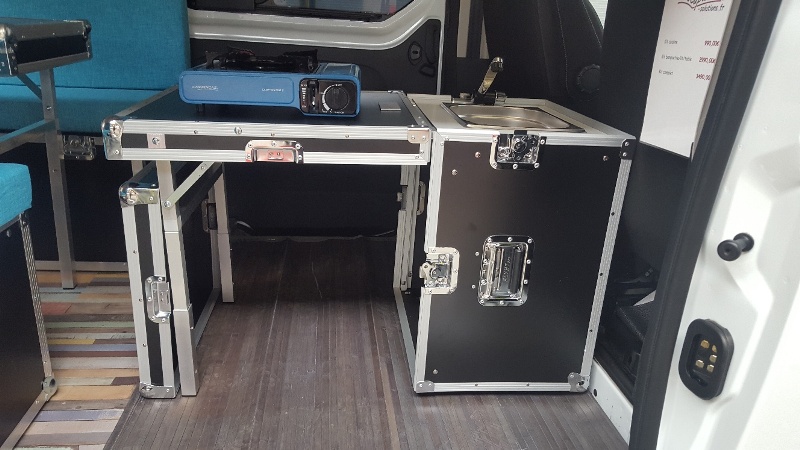 Grâce à ce kit amovible, en quelques instants, vous installerez votre lit, votre table et même votre cuisine équipée du gaz et d’une réserve d’eau propre.